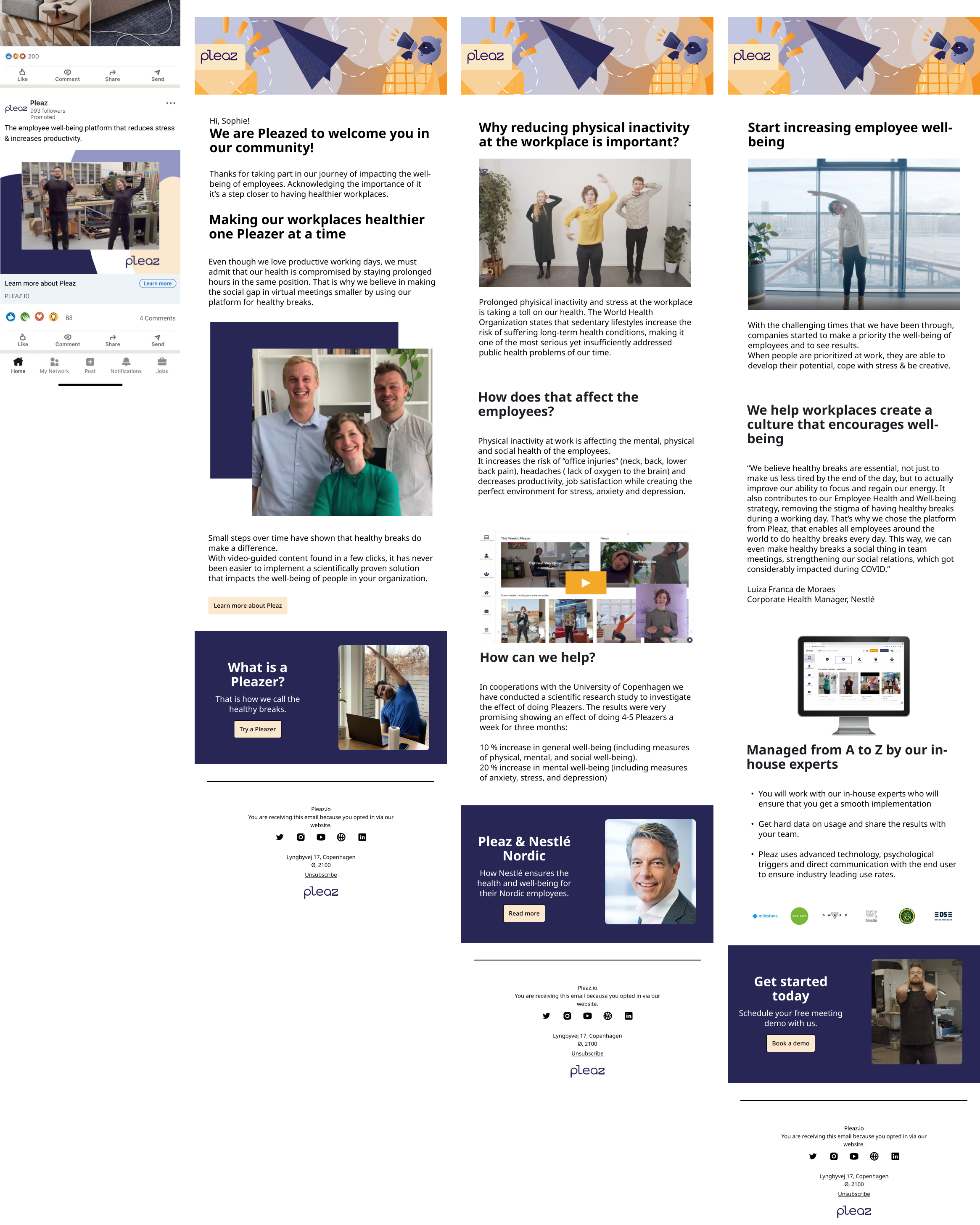 Email 1: In the first email, the potential customer is welcomed and introduced to the company/values are established. The user is welcomed by thanking and praising his choice of acknowledging the importance of well-being of employees, in order to create a “feel-good” mood. Then it’s introduced to company’s mission ( a bit about who, why and how) and in the end we share “what is a pleazer”, to get used with the terms from the very beginning and offer the opportunity to “Try a Pleazer” as a CTA.